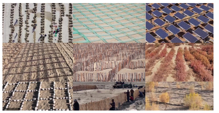 工程治沙:这种方式主要通过在沙地上插入芦苇秆,打上草方格,或者布设高立式沙障来阻挡流沙的扩散。例如,在新疆和田地区民丰县,中铁建发展集团承担了35公里的锁边固沙任务,通过高立式沙障、草方格、宽林带三道防线构建起“固沙+阻沙”的综合防治体系。这些沙障主要由木桩连接芦苇秆防风面组接而成,能够减弱风力,使沙子固定得更稳。工程治沙成本低、见效快,是一种非常有效的物理阻挡方式。